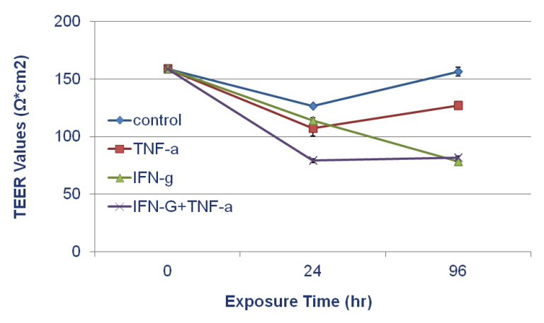 Effect of Inflammatory Signals on EpiIntestinal Barrier: TEER values of SMI-100-FT tissue following 96 hr. exposure to TNF-α (40 ng/ml), IFN-y (10 ng/ml), and TNF-α + IFN-y. Medium treated wells were used as untreated controls.